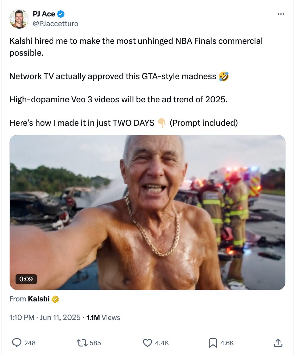 It got millions of impressions. PJ thinks that these high-dopamine AI videos will be the ad trend of 2025. Maybe this doesn't fit your B2B (boring) brand, but there is definitely something to learn from this new medium.