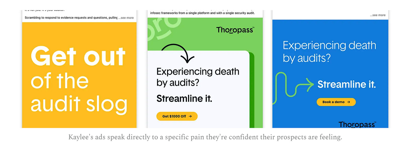 When Kaylee was working with Thoropass as a fractional VP of Marketing she wasn’t running standard verticalized ABM ads. She’s ran use-case-focused messaging to segments she used AI to find. Such an intelligent way to laser-focus their messaging. Not to anyone who visited their website, but to accounts with a compelling reason to solve this problem right now (*real* intent).