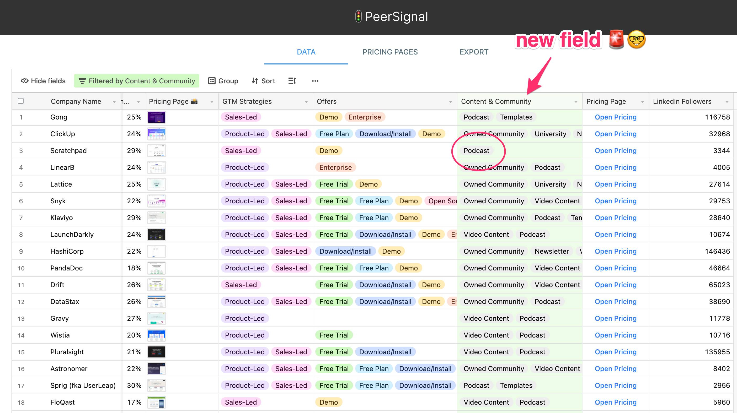 We found 155 companies in the B2B Growth Index with a prominent podcast. You can now filter on this new field in both the PLG and B2B index. Here's what you'll next time you login. ๐