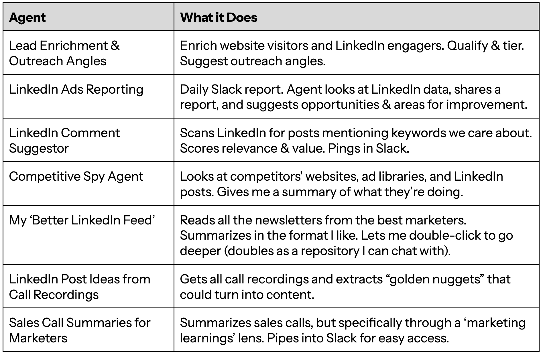 AI Agent Ideas. We build account research agents for companies. I had ChatGPT suggest some ideas. While these are not perfect, they are a nice starting point.