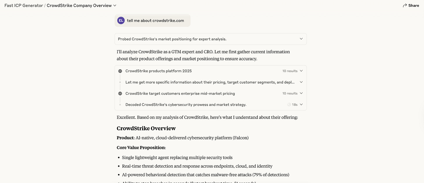 I built her a simple Claude project that she can chat with. All she has to do is say, “tell me about [company domain].”