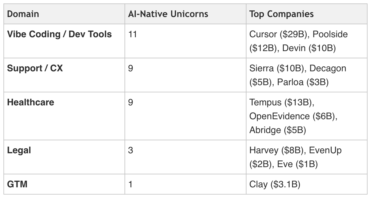 Categories like support, dev tools, and legal have multiple domain-specific AI companies breaking through. Sierra hit $100M ARR in under two years. Harvey grew 8x in 2025 to an $8B valuation. Cursor is worth $29B.