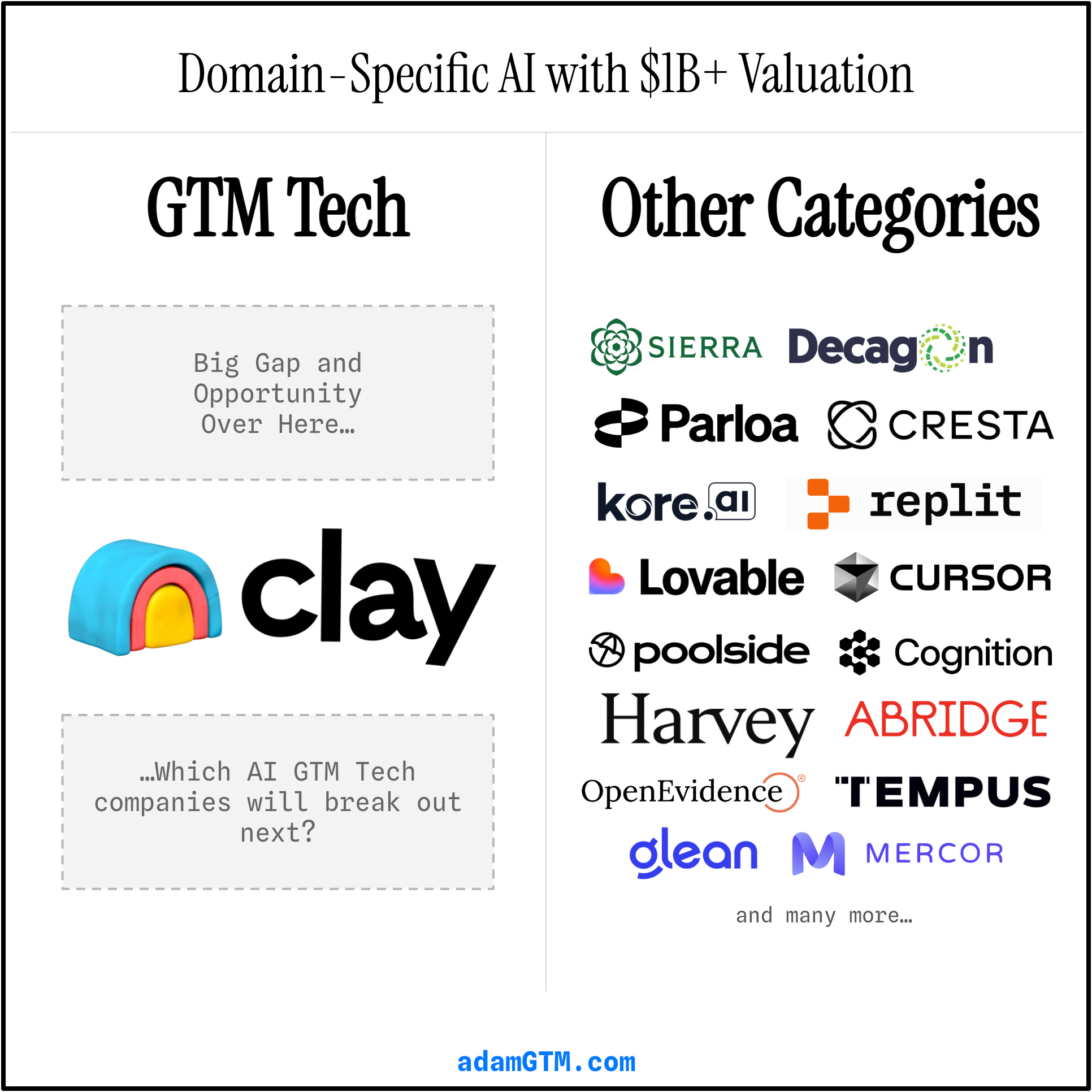 Clay is the only recent break out winner. Harvey (legal) alone is worth more than all AI-native GTM companies combined.